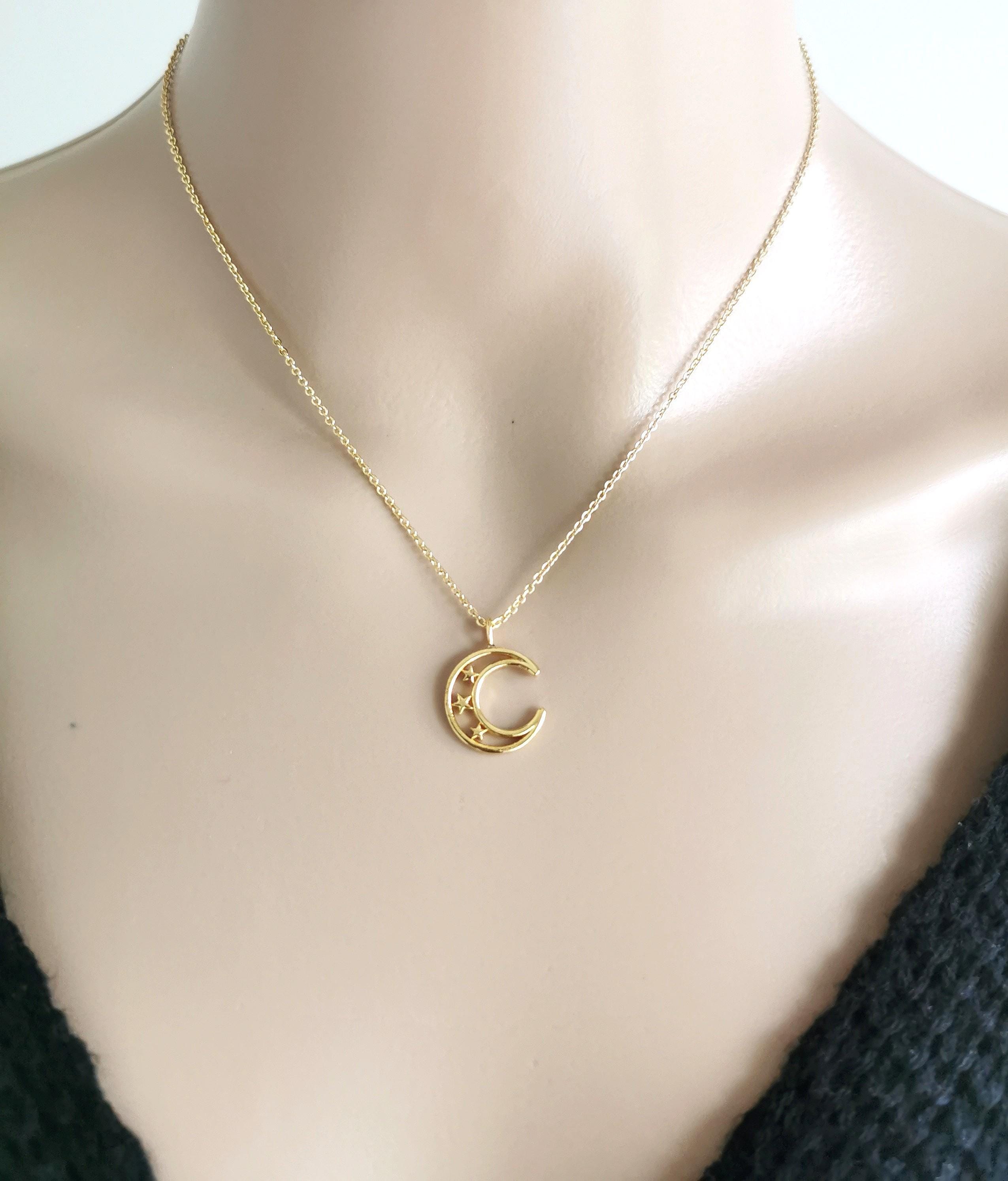 The gold moon pendant, gold plated curb necklace and gold spring clasp are long lasting and durable with jewelry care.