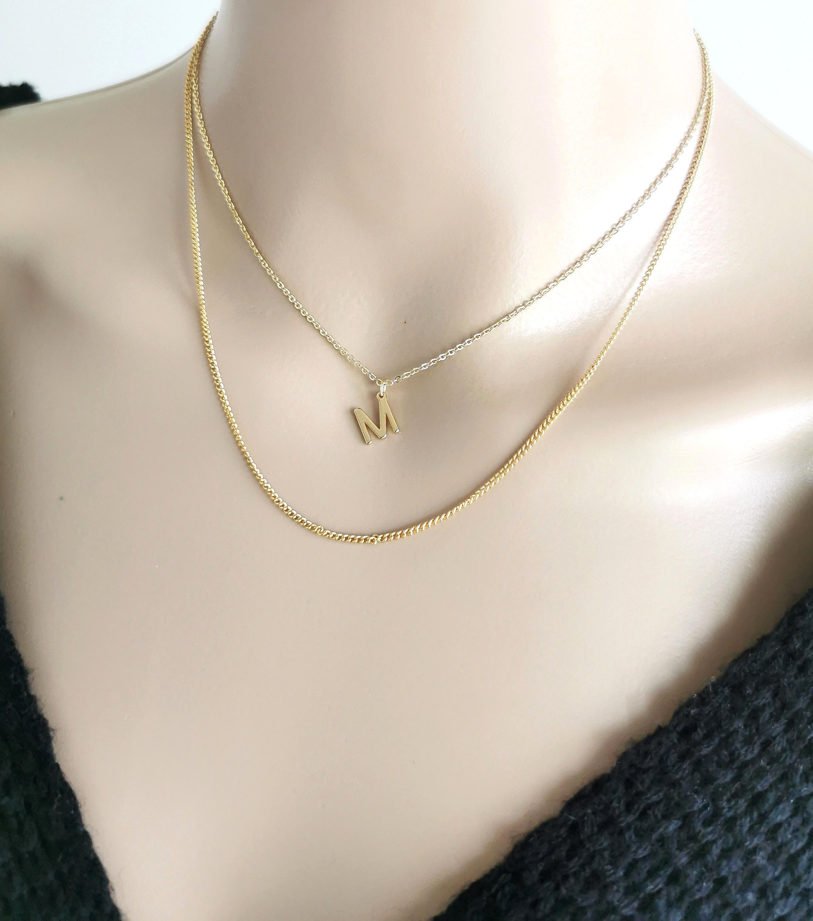 Layered necklace set - gold initial necklace at top layer and shiny gold curb necklace at bottom layer. For a minimal look, you can get one necklace, the initial necklace or the curb necklace.