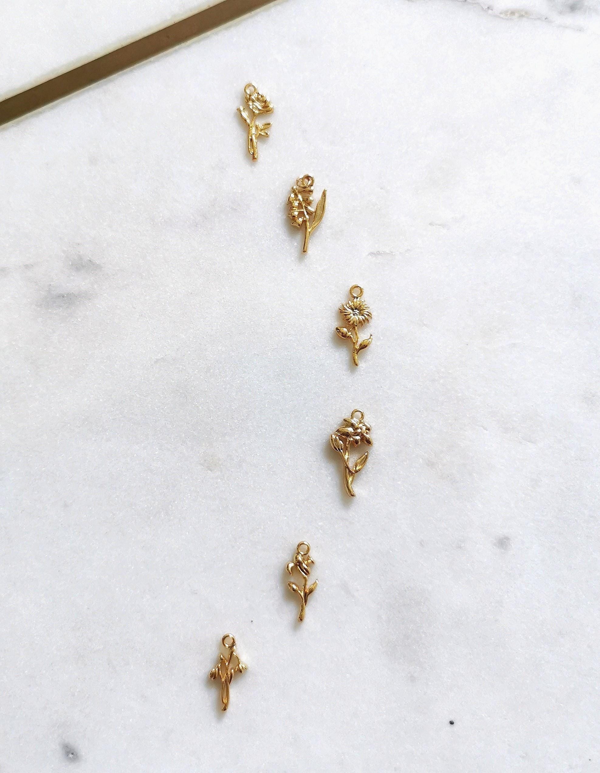 - Gold plated birthflower measures at 1.6cm x 0.8cm and tiny gold plated initial measures at 1.1cm height x 0.4cm width