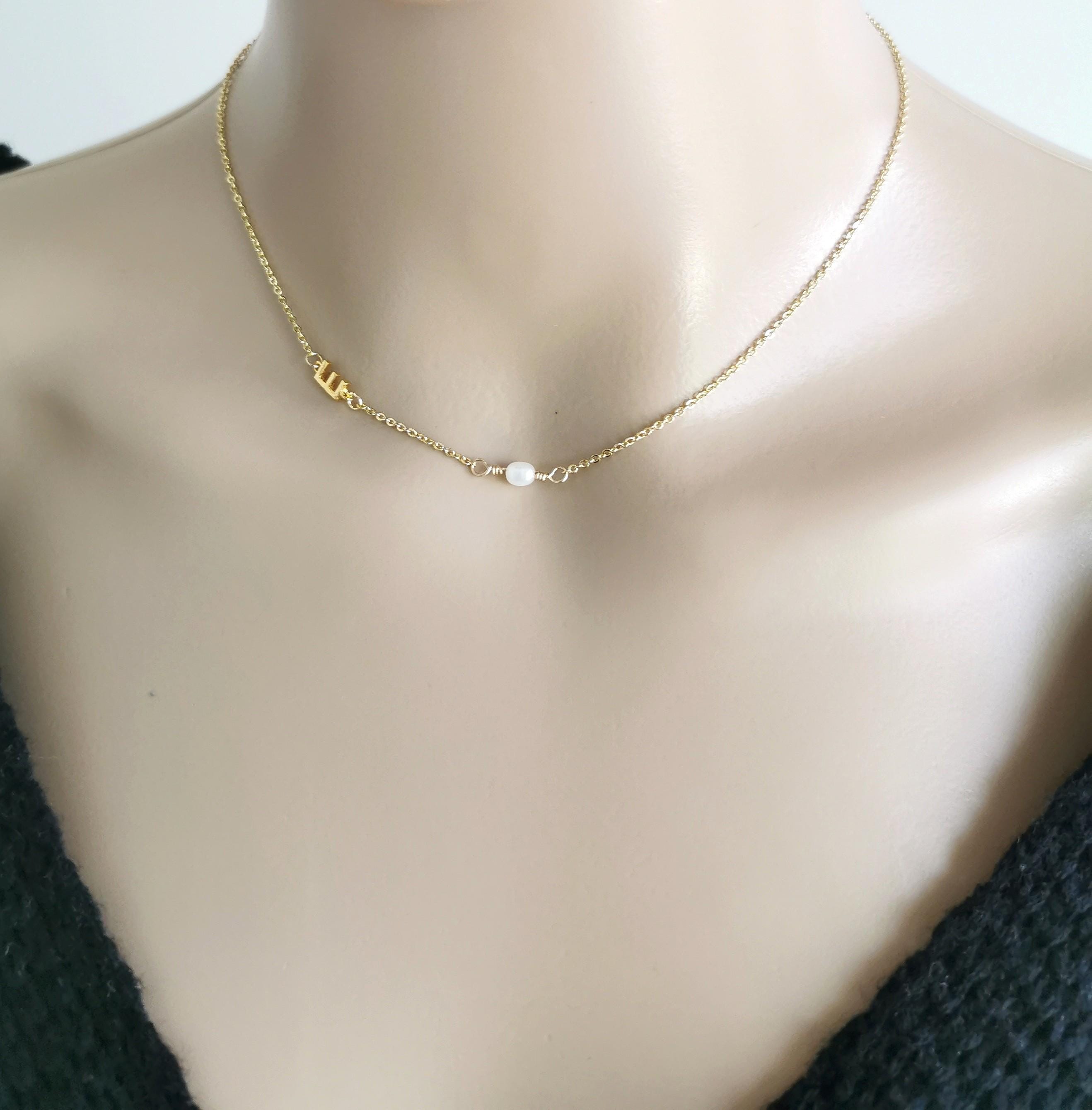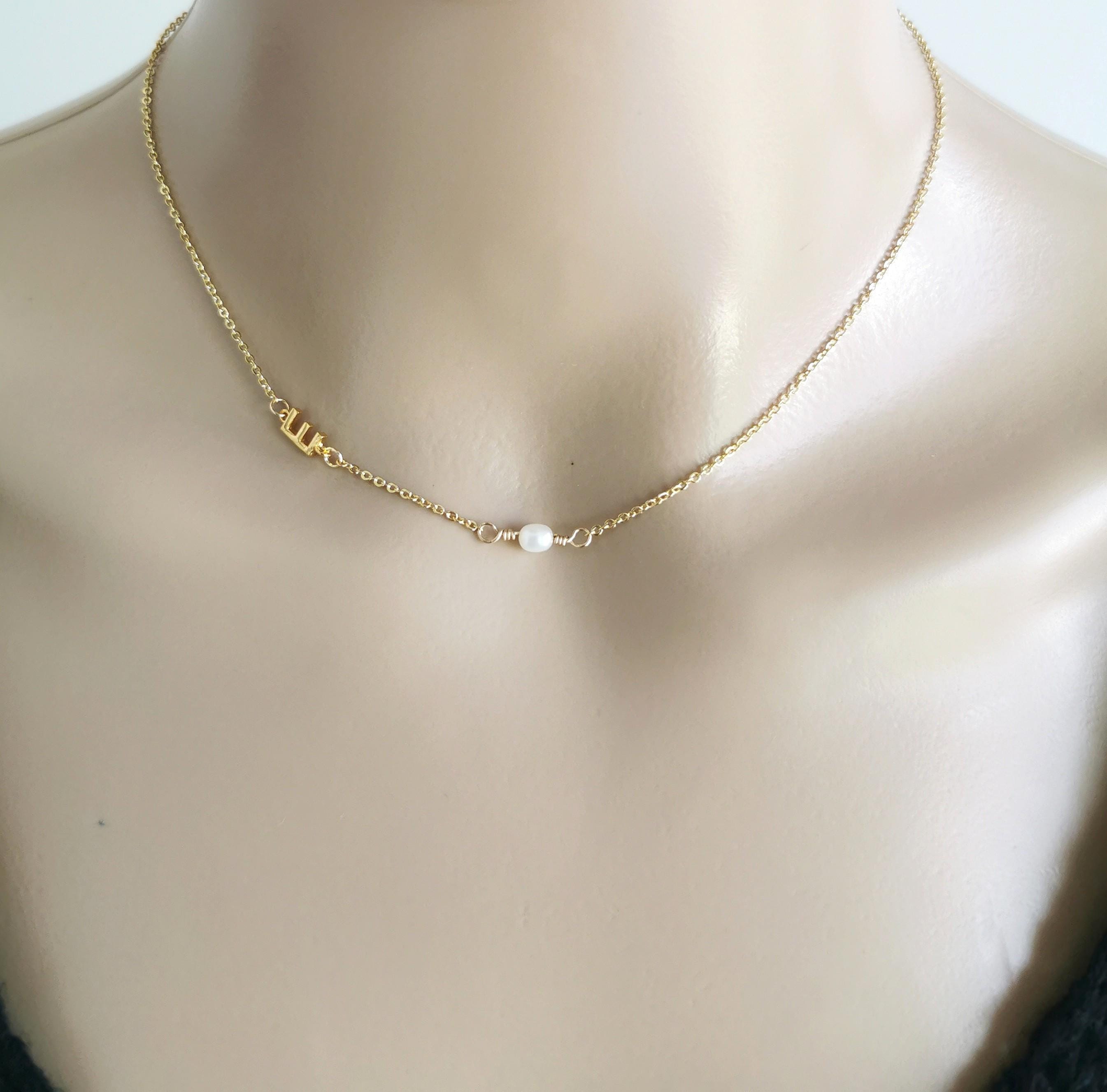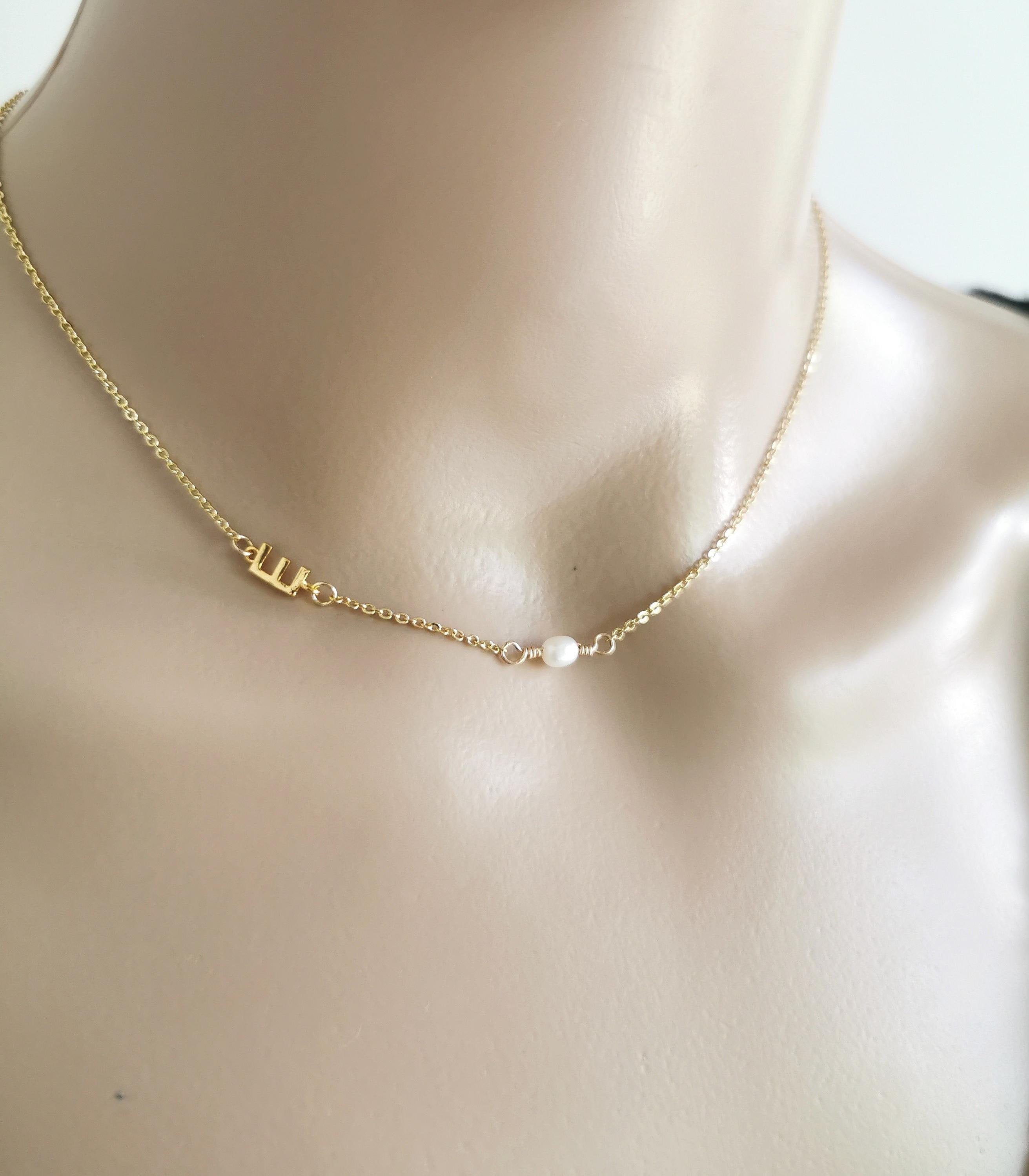 Beautiful natural freshwater pearl with sideway tiny gold initial necklace, dainty and elegant piece of custom jewelry.