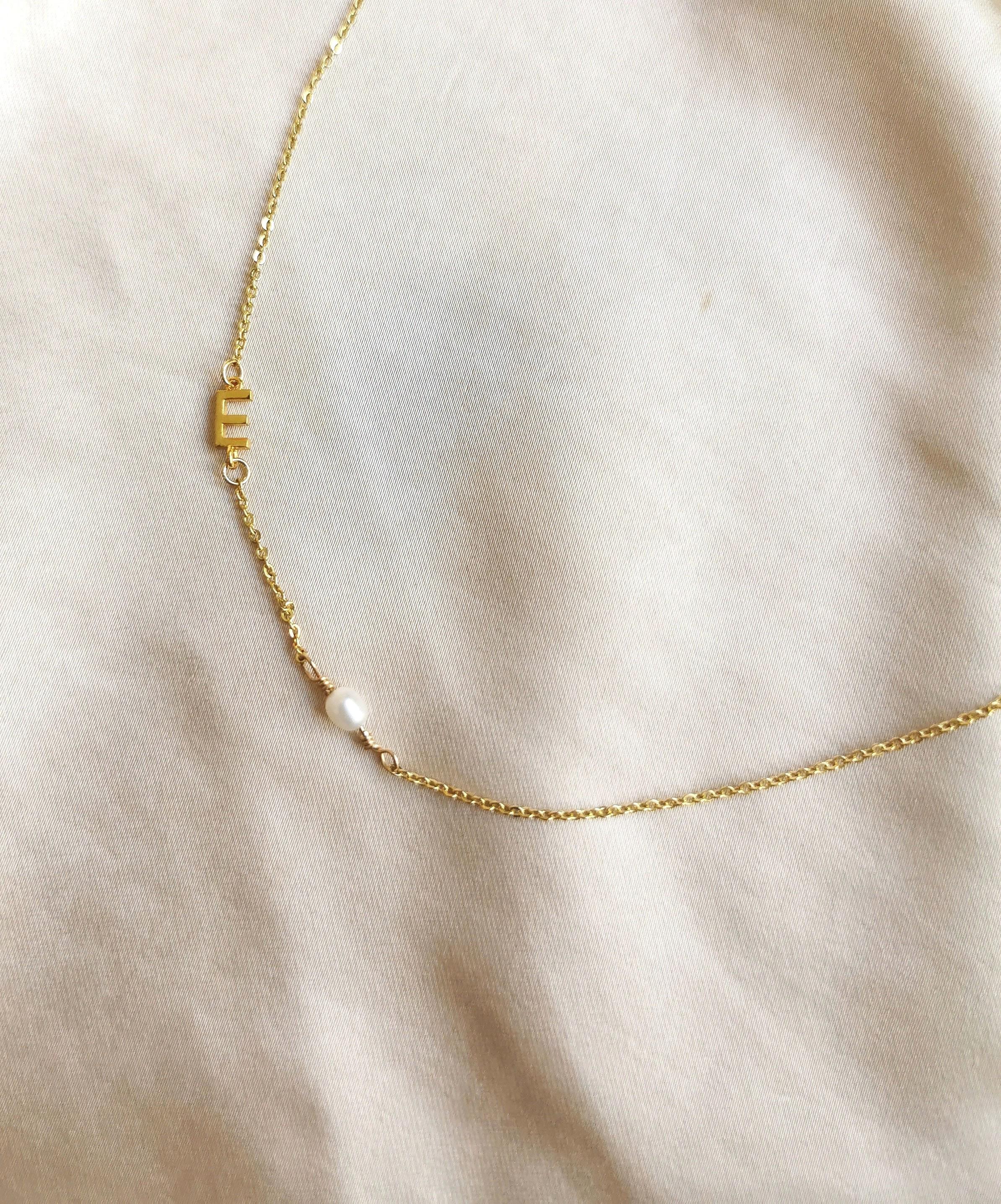 This necklace includes a pearl in the middle and a sideway initial. Option without the initial available for selection at checkout.