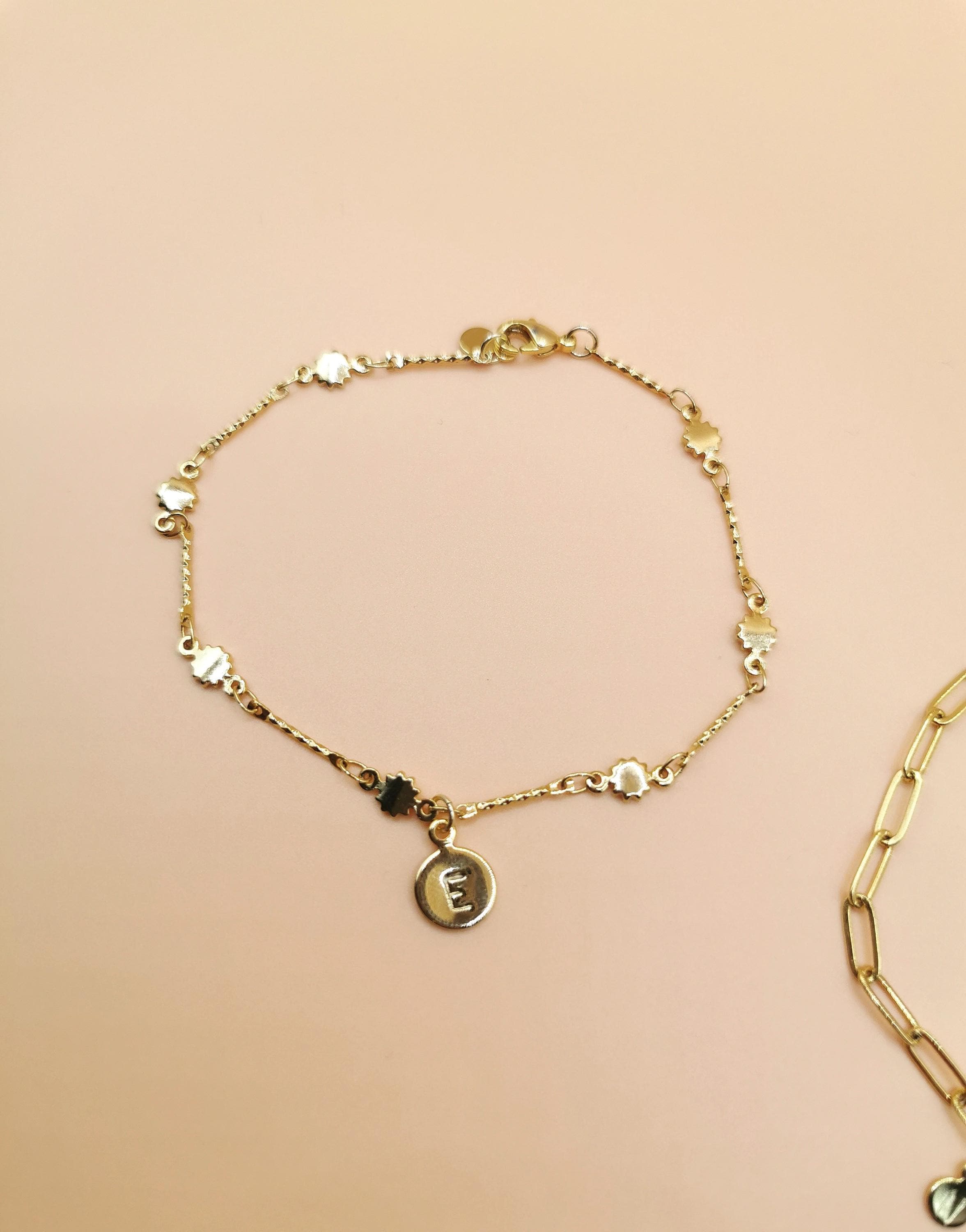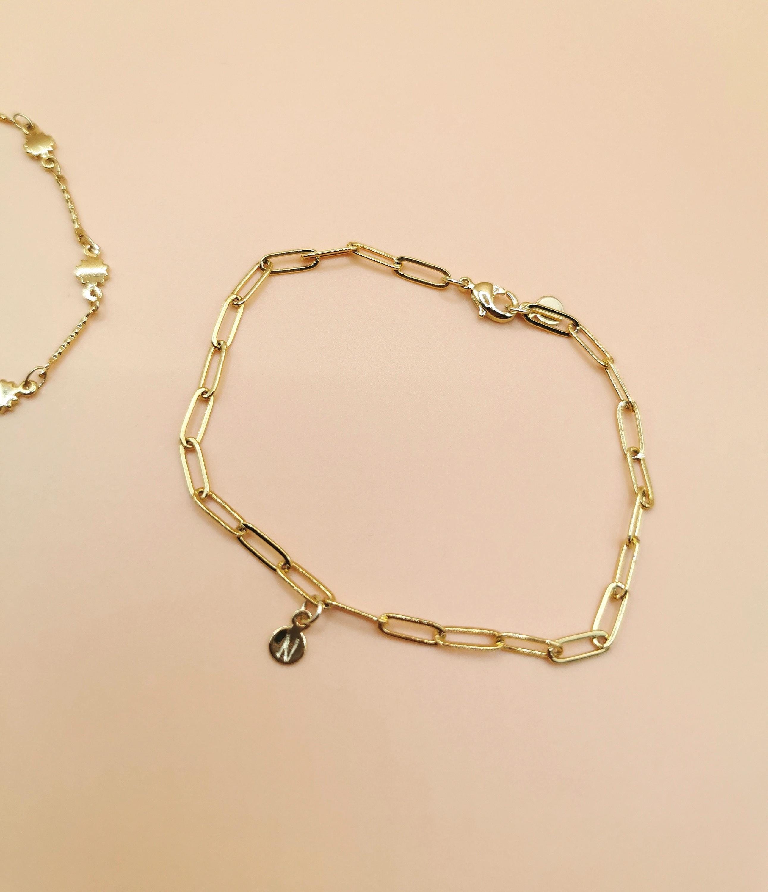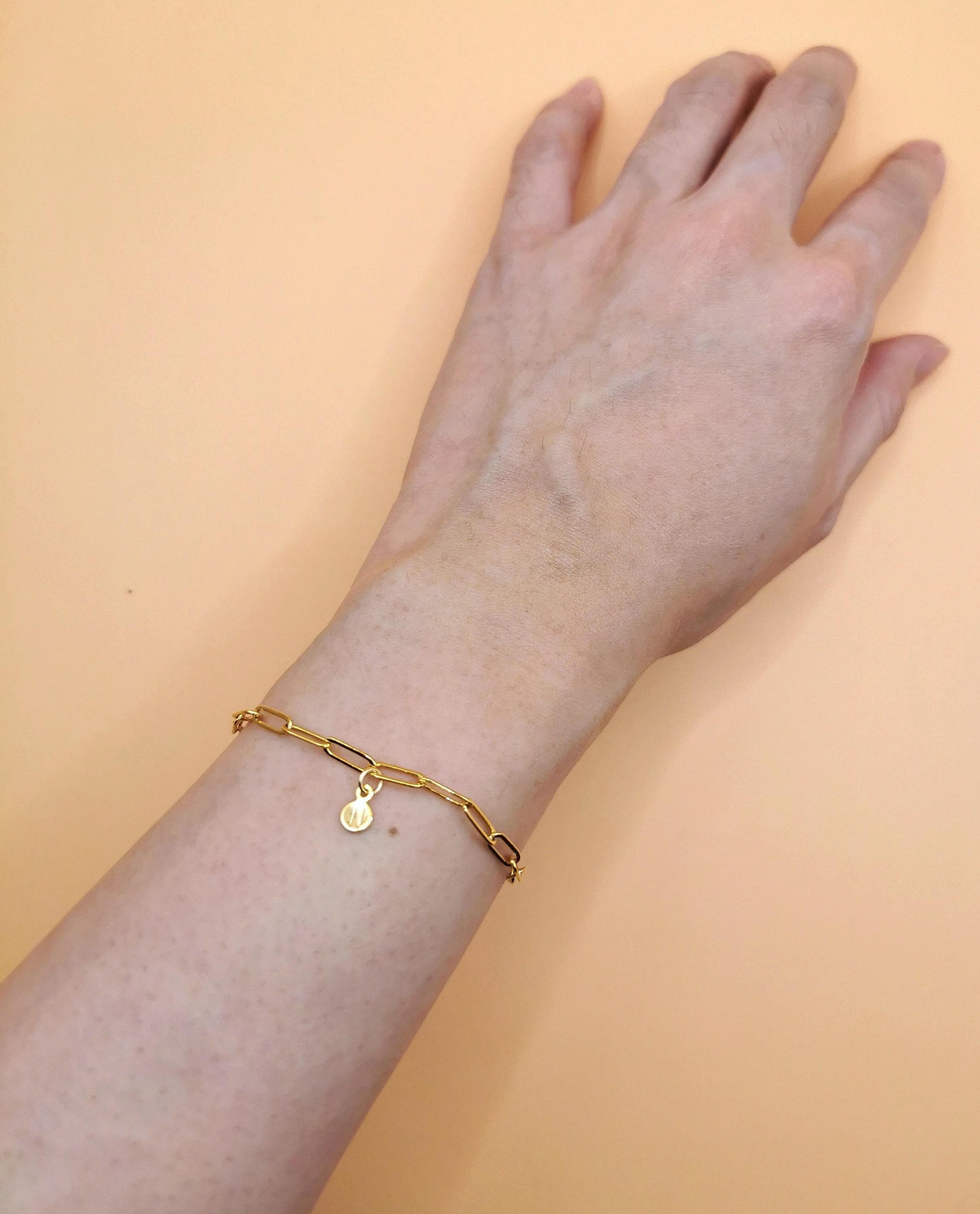 - Image 2 shows gold sun bracelet with 8mm diameter charm with handstamped initial and gold paperclip bracelet with 4mm diameter charm with handstamped initial. The 4mm charm is thin and tiny.