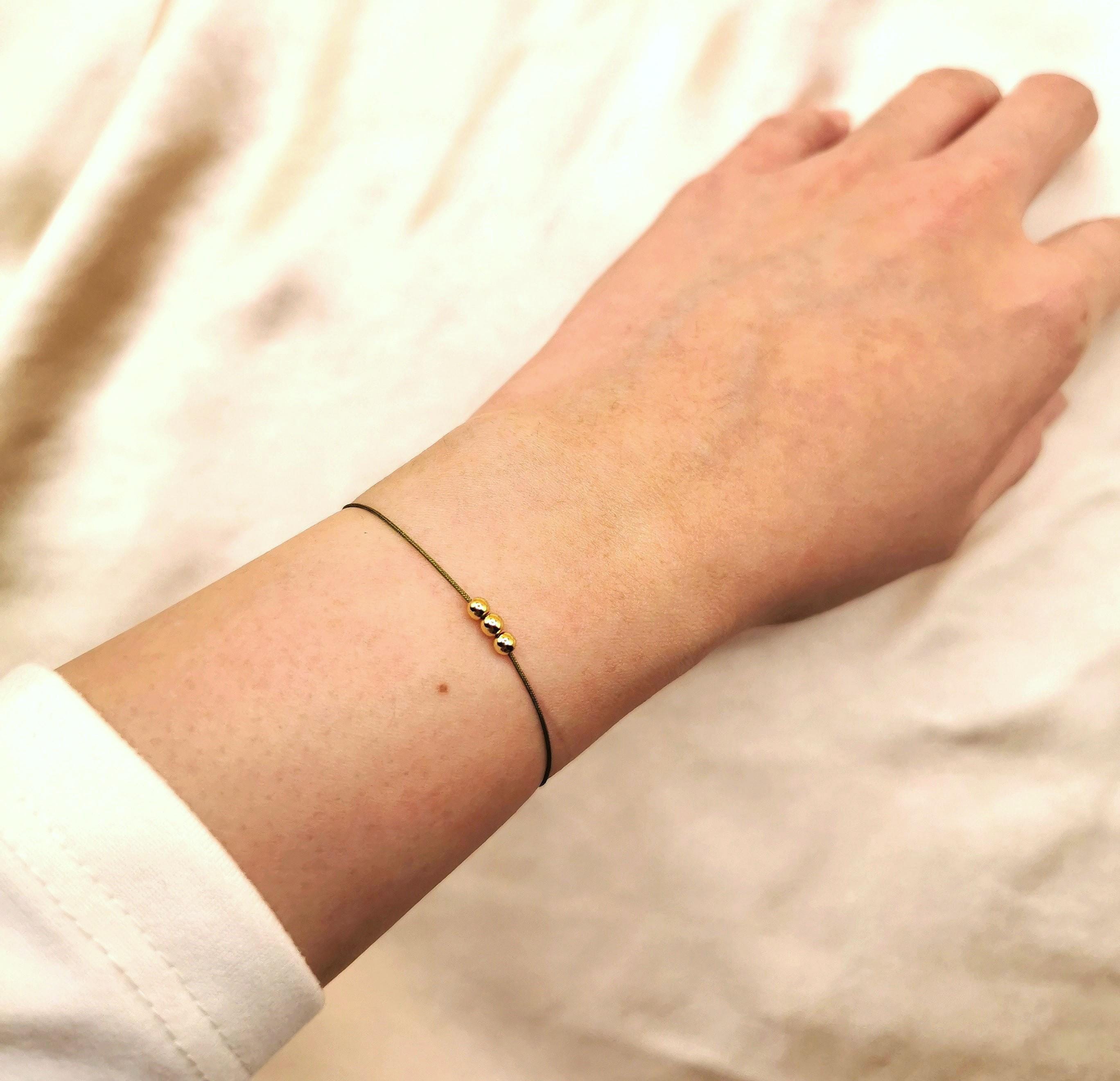 Image 1 shows black cord bracelet with 1 gold bead and green cord bracelet with 3 gold beads