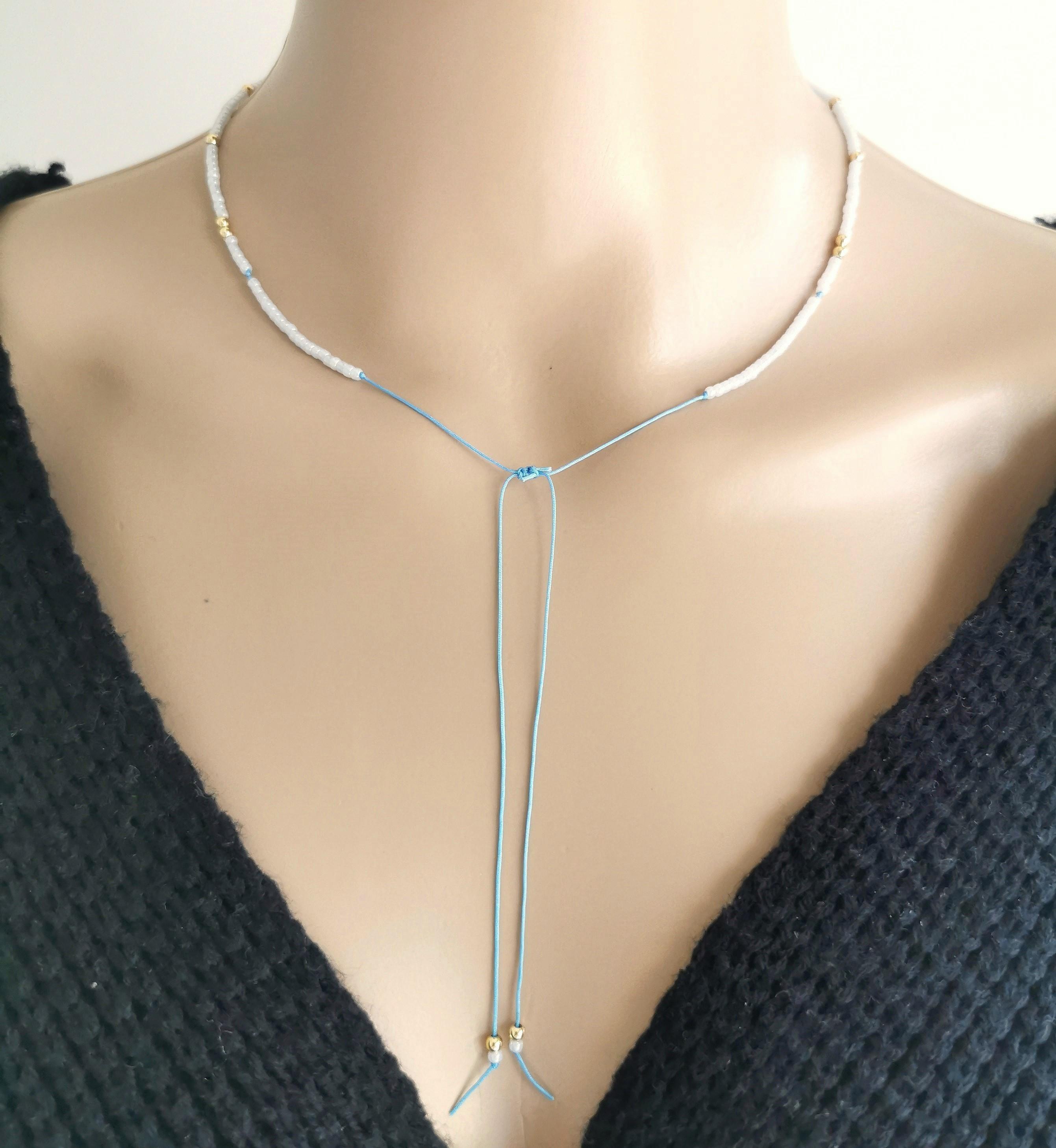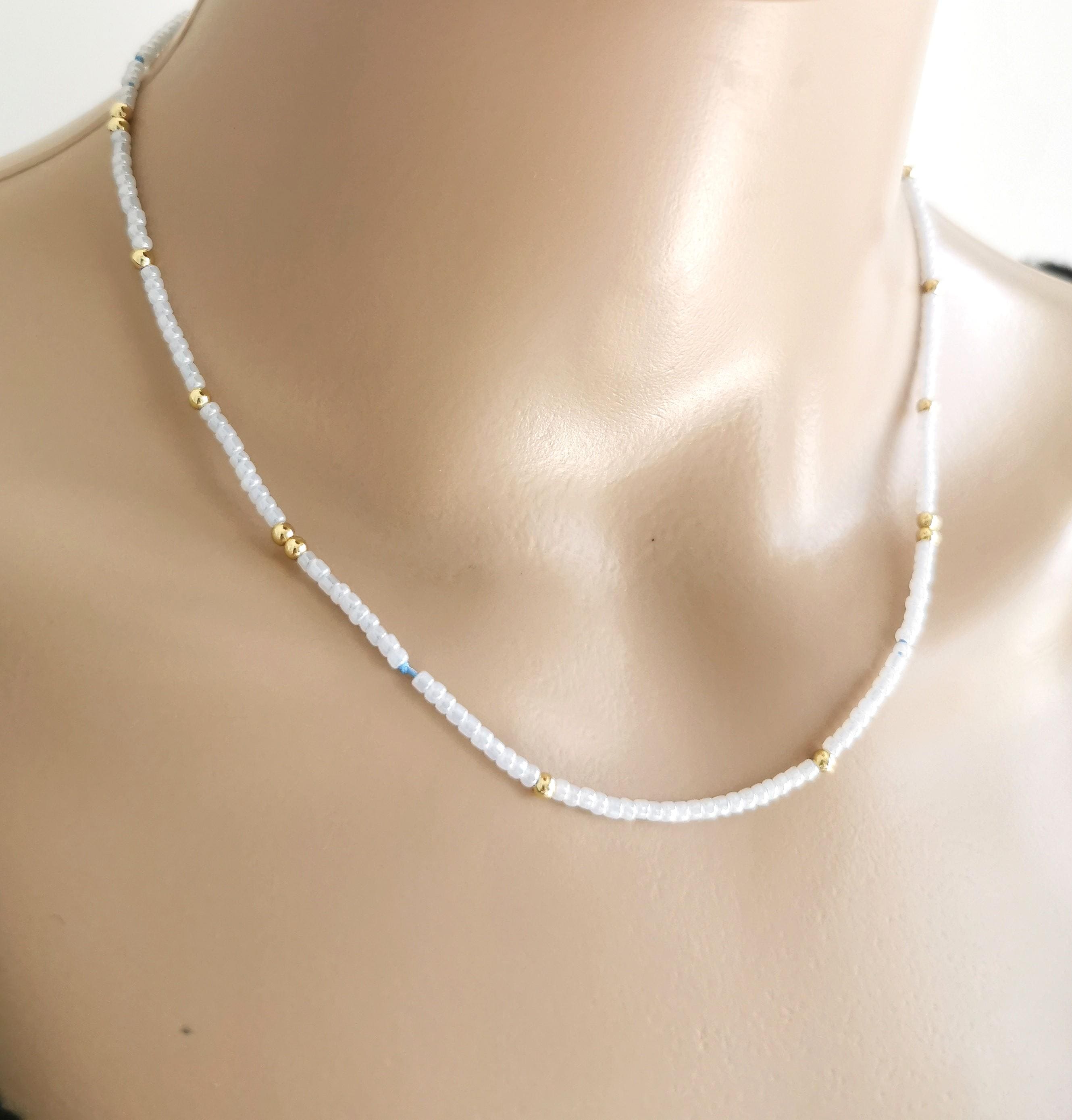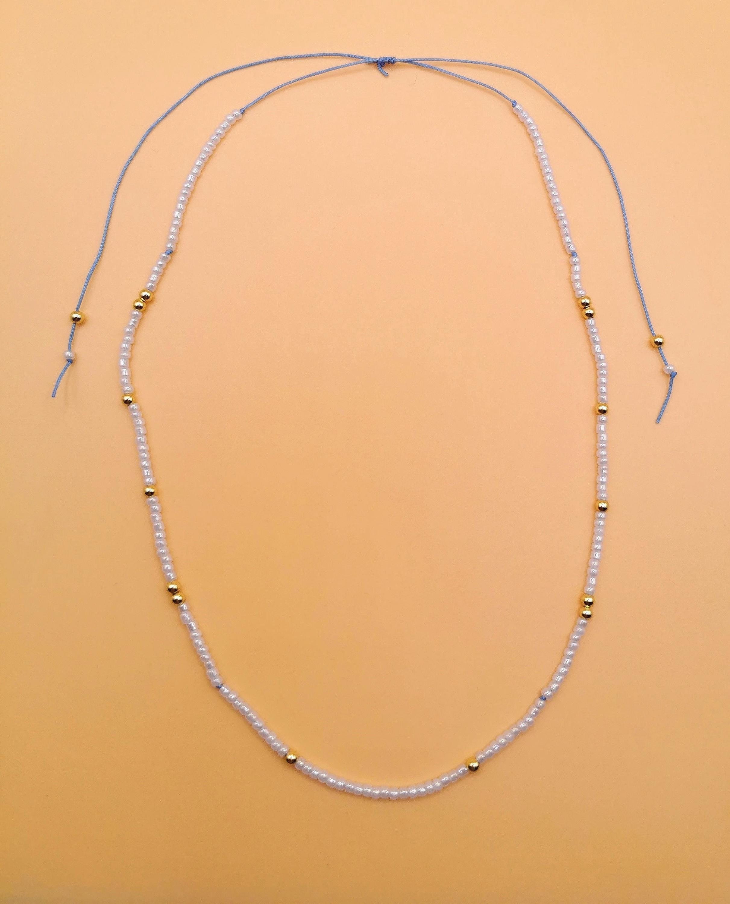 This necklace with the white glass seed beads which looks beautiful with the shiny effect from the glass beads. The necklace gives off a beautiful glow on you.