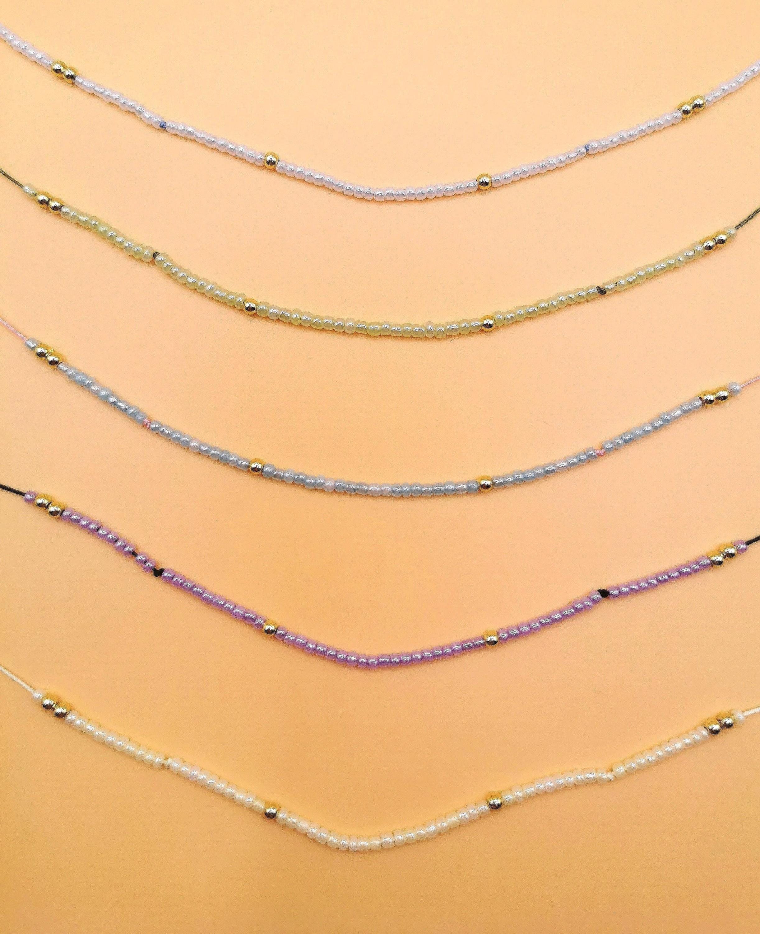 - Necklace example at image 5 from top, white seed beads, green seed beads, blue seed beads, dark pink seed beads, yellow seed beads